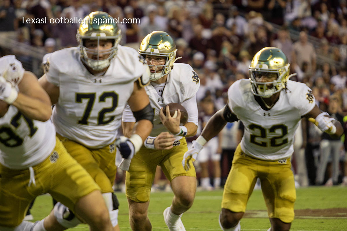 Es un terreno áspero y el QB de Texas A & M Conner Weigman (15) es interceptado por Xavier Watts (0). Los equipos se fueron al medio tiempo empatados 6-6. En el 3er cuarto la explosividad de la línea ofensiva finalmente pone en marcha el ataque terrestre dorado, corriendo con precisión y coraje. El ruidoso estadio no puede ser más intimidante con todas las toallas blancas, 107,000 almas gritando y clamando por el dominio contra los Irish. Jadarian Price corre detrás del gran bloqueo de los orgullosos linieros y supera a la secundaria de los Aggies para una carrera de touchdown de 47 yardas. Para los linieros irlandeses Aamil Wagner, Sam Pendleton y Anthonie Knapp era la primera vez que abrían un juego.