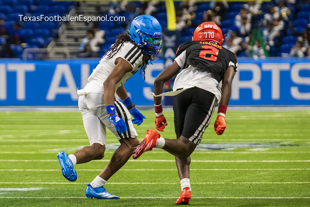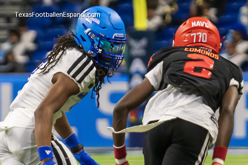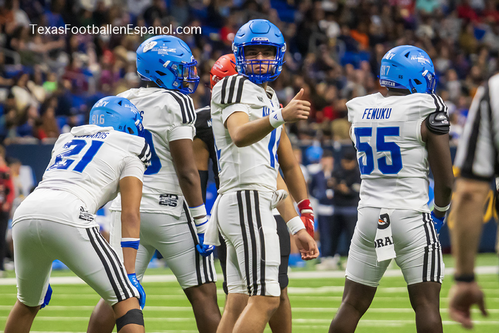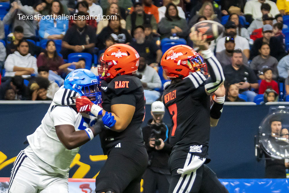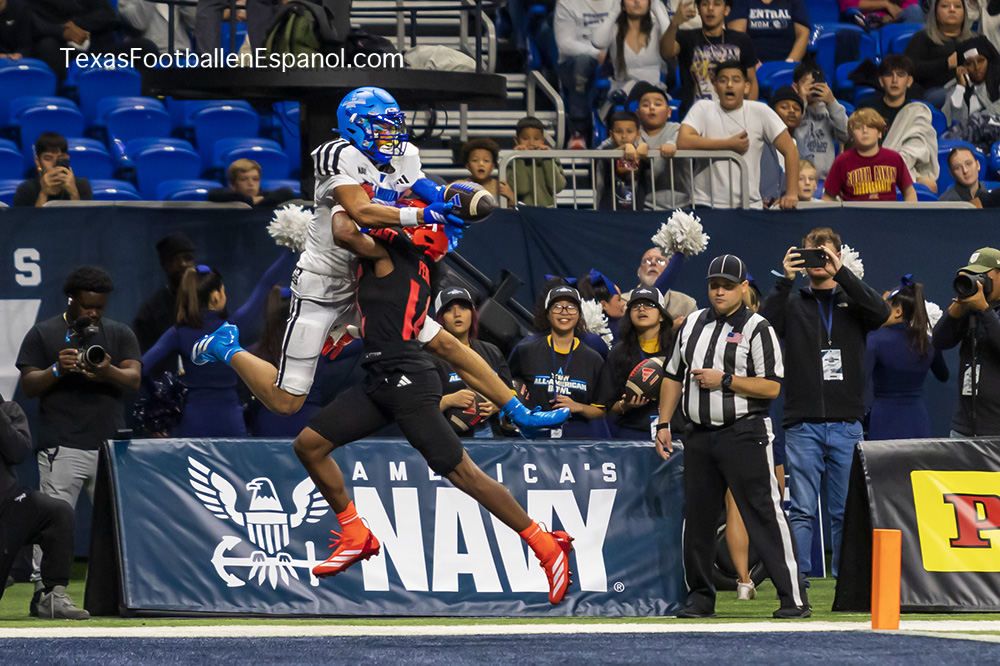 Keisean Henderson es un mariscal de campo sobresaliente de Legacy the School of Sports Sciences en Spring, Texas. Brilló con una actuación que le valió el premio al Jugador Más Valioso (MVP). Su calma bajo presión quedó demostrada. Conectó un espectacular pase de touchdown de 91 yardas con Jalen Cooper, futuro jugador de SMU. Este pase hizo que todo el estadio se pusiera de pie. Esta jugada clave marcó el tono del dominio del Oeste durante el partido.