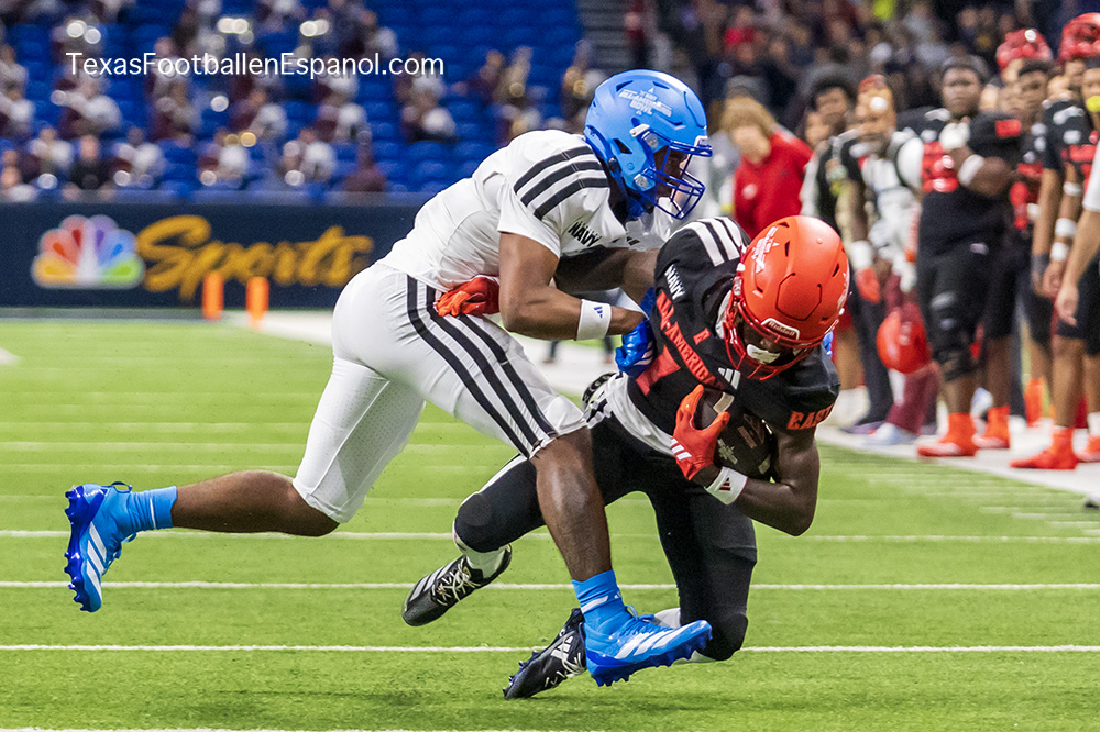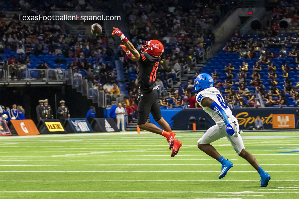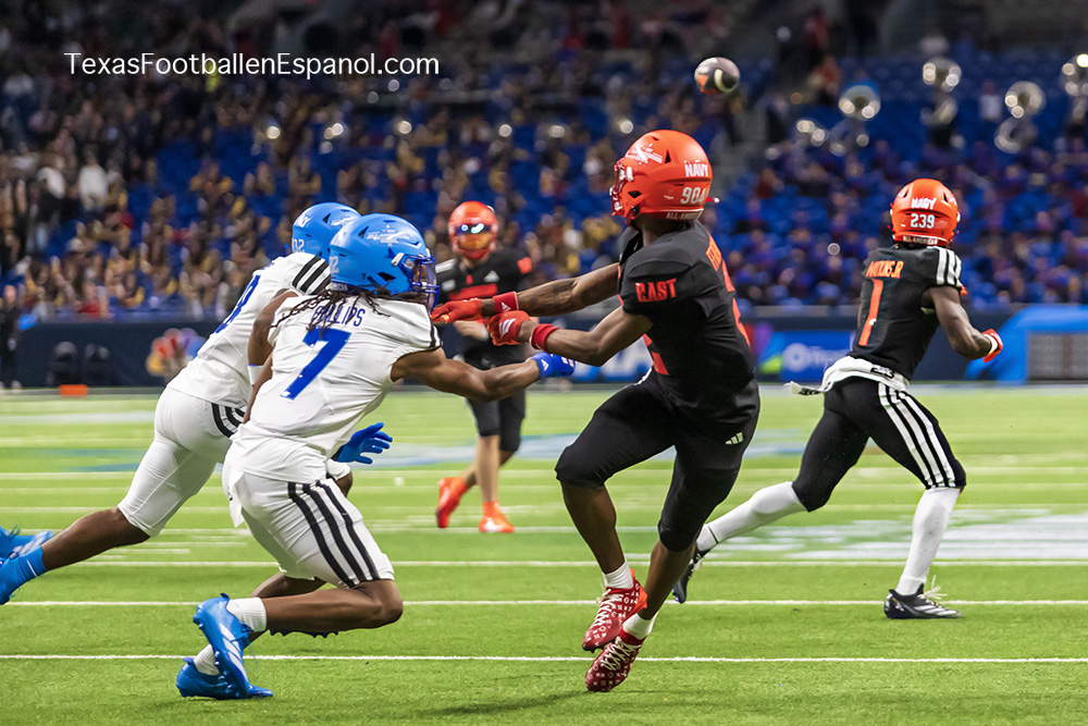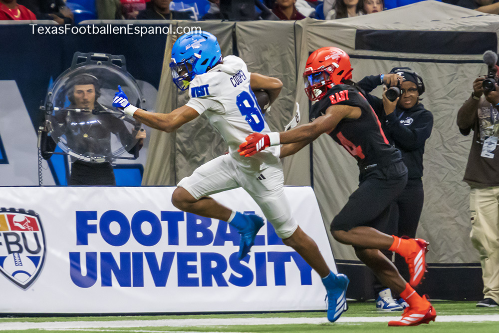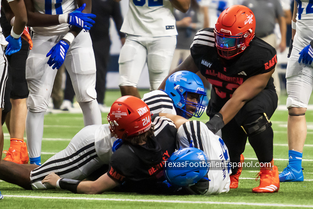 Keisean Henderson es un mariscal de campo sobresaliente de Legacy the School of Sports Sciences en Spring, Texas. Brilló con una actuación que le valió el premio al Jugador Más Valioso (MVP). Su calma bajo presión quedó demostrada. Conectó un espectacular pase de touchdown de 91 yardas con Jalen Cooper, futuro jugador de SMU. Este pase hizo que todo el estadio se pusiera de pie. Esta jugada clave marcó el tono del dominio del Oeste durante el partido.