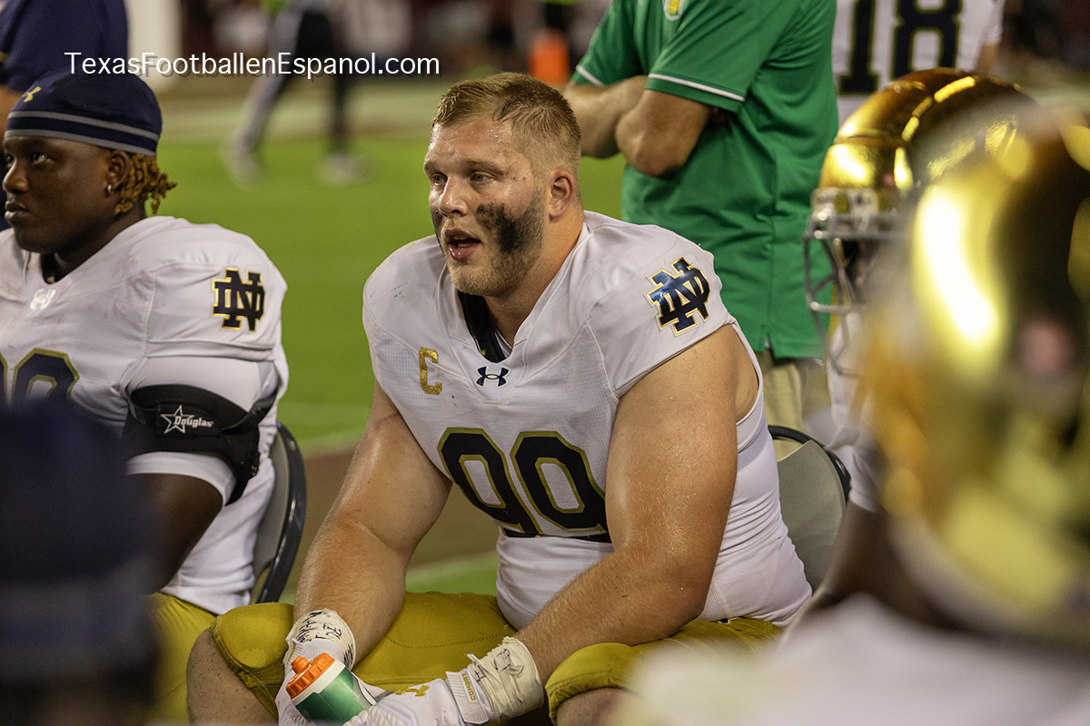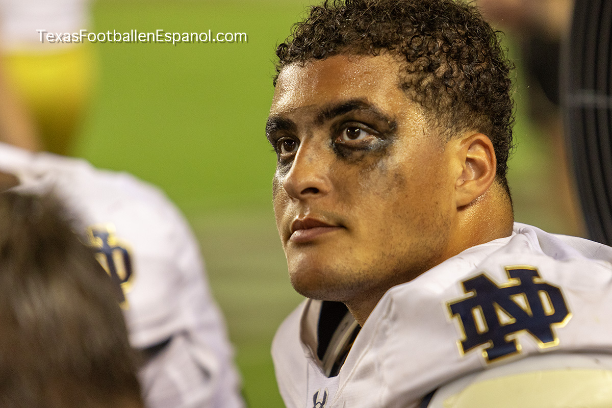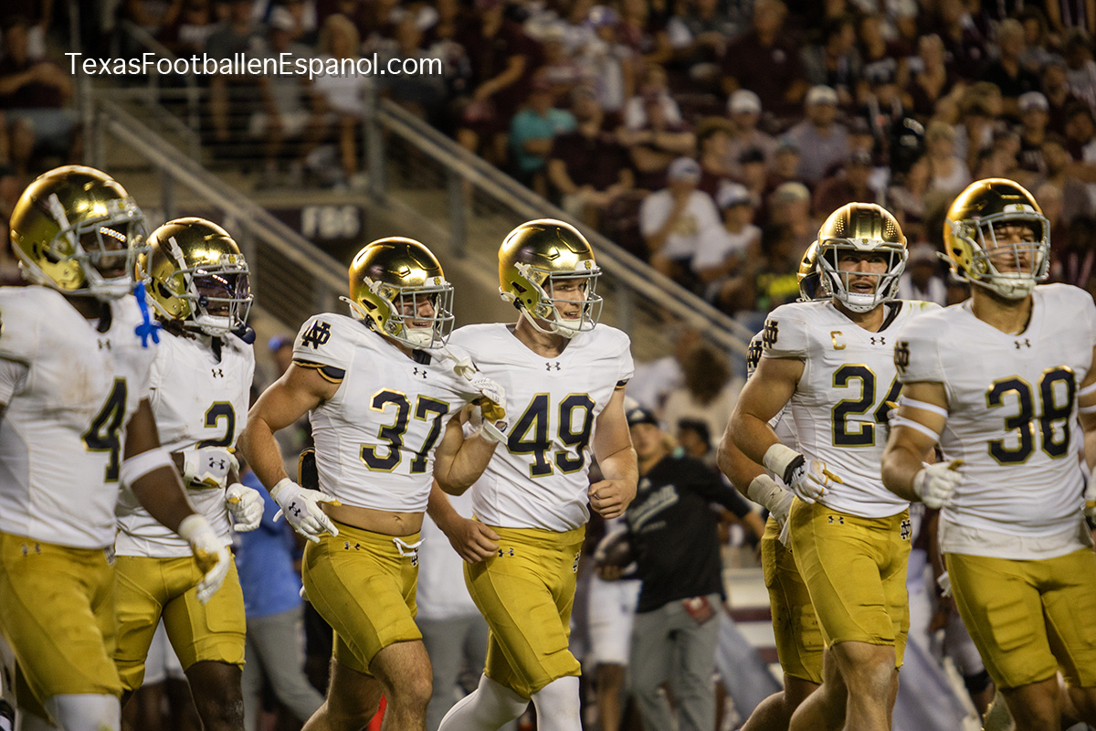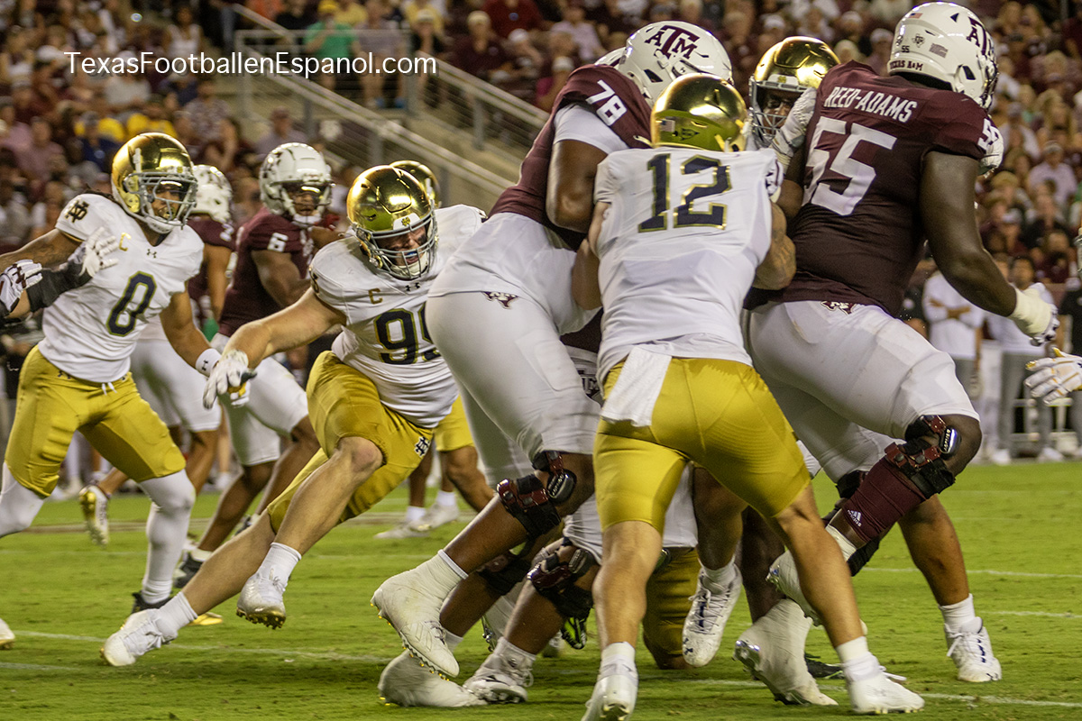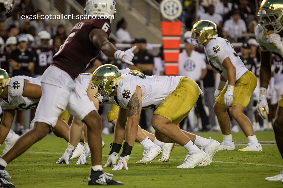 A group of thirsty horsemen arrived from South Bend to represent a battle between two top 25 teams. #7 Notre Dame faces #20 Texas A & M. Tonight 8.2 million people are watching the kickoff. The excitement is gigantic before the duel of two hungry teams. In Texas everything is bigger, even the noise. White pom poms everywhere in an electrifying atmosphere. Both defenses establish their rules immediately, the Irish defense is on a mission. We miss our friend Gabriel Rubio (97), but here are the two relentless steeds that have stood firm, neighing with courage. Rylie Mills (99) and Howard Cross III (56).