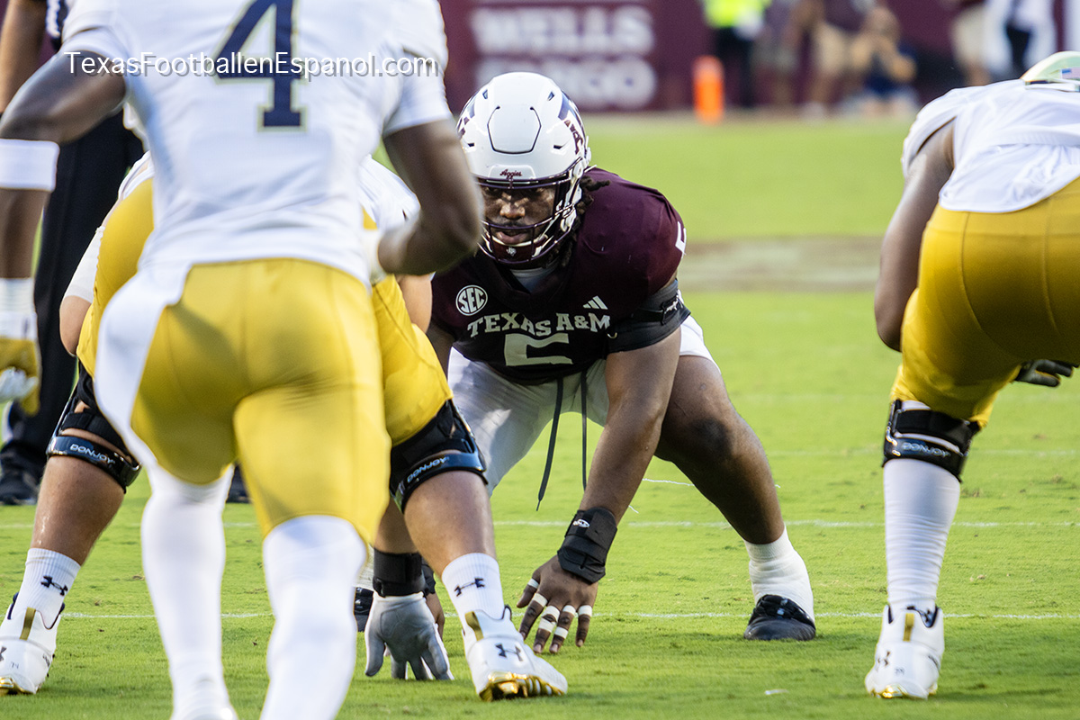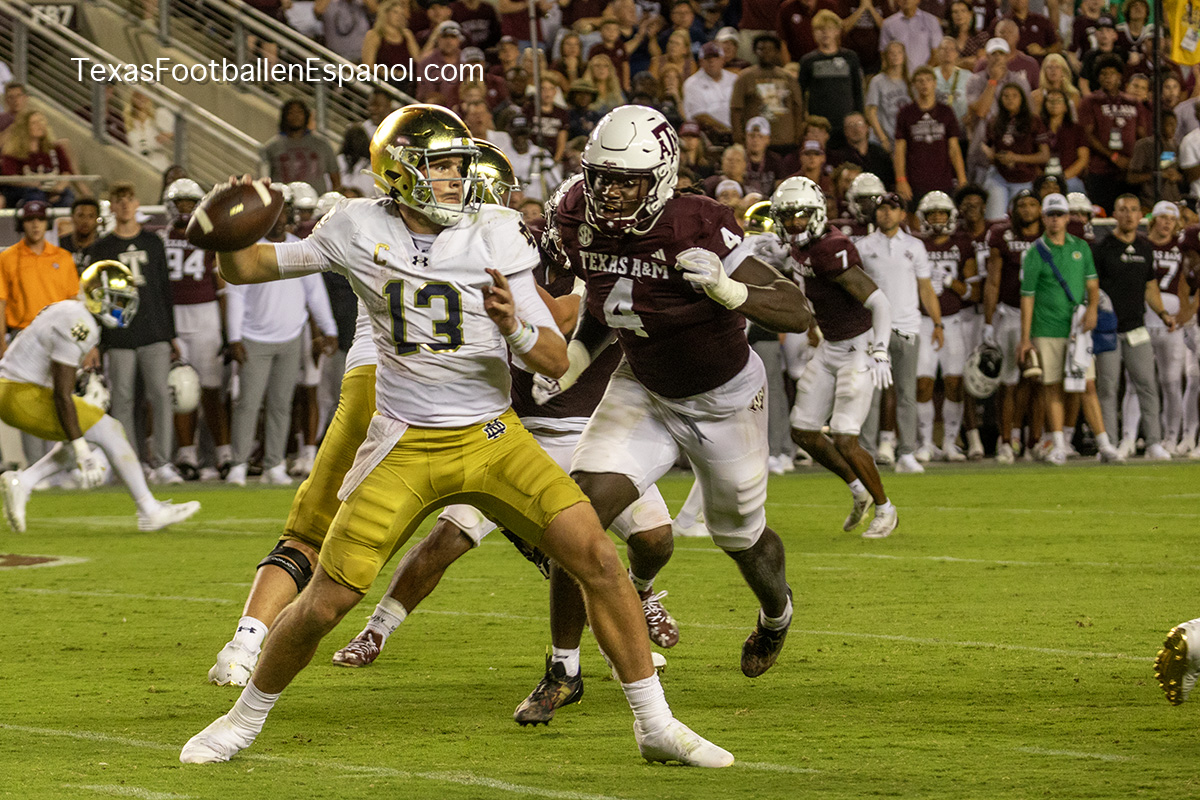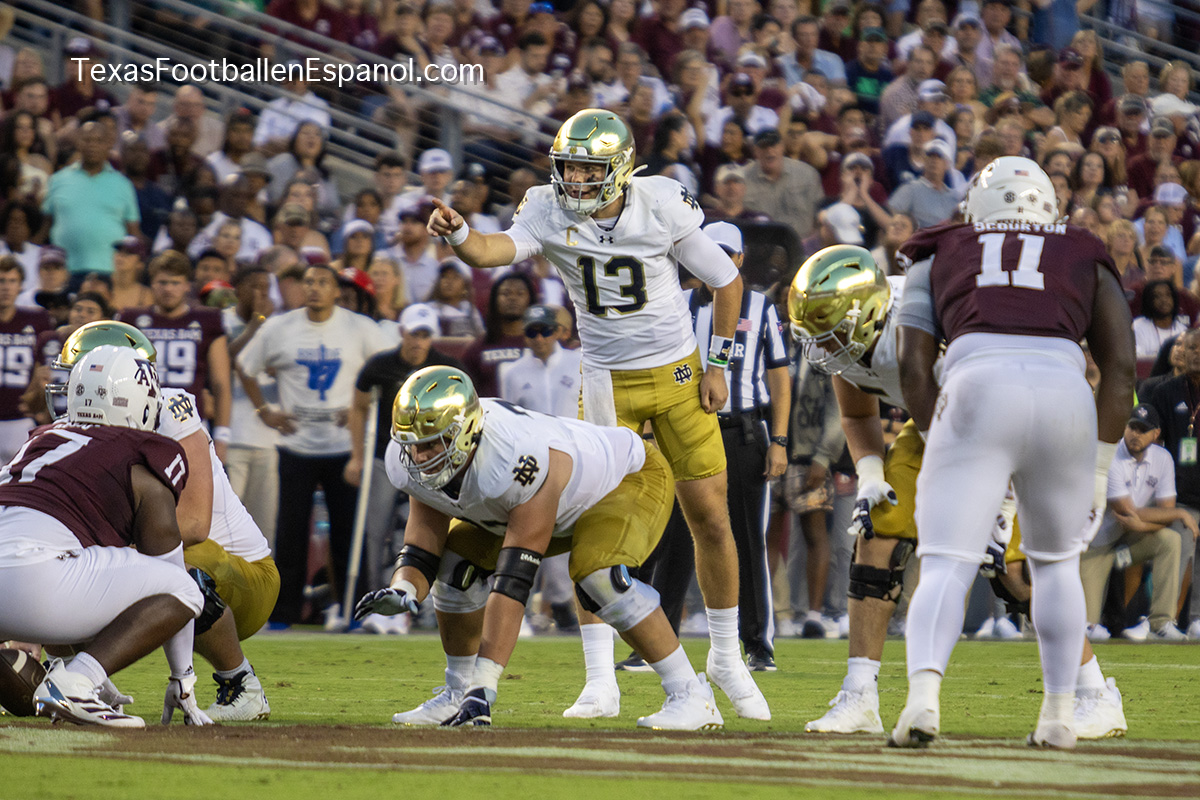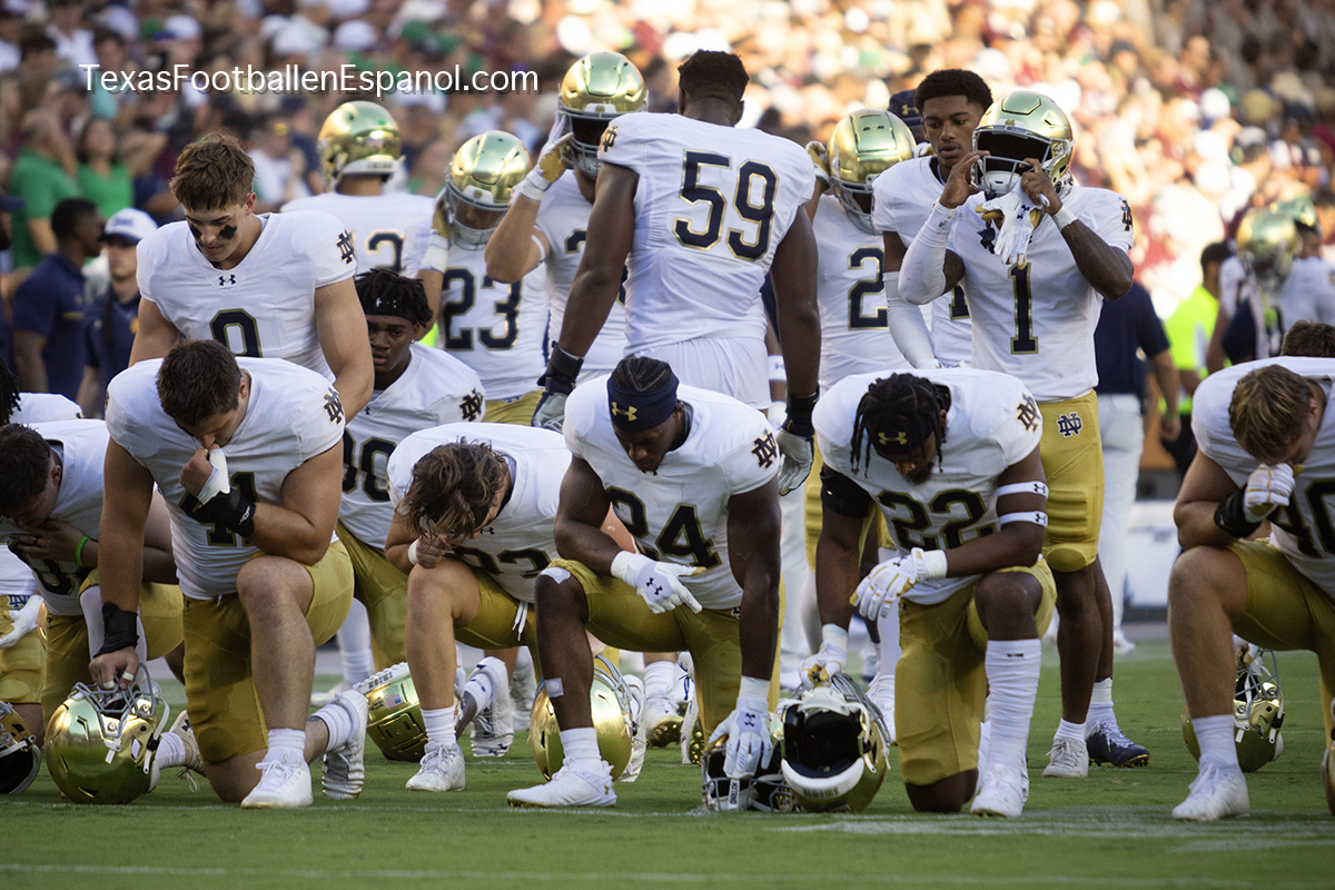 A group of thirsty horsemen arrived from South Bend to represent a battle between two top 25 teams. #7 Notre Dame faces #20 Texas A & M. Tonight 8.2 million people are watching the kickoff. The excitement is gigantic before the duel of two hungry teams. In Texas everything is bigger, even the noise. White pom poms everywhere in an electrifying atmosphere. Both defenses establish their rules immediately, the Irish defense is on a mission. We miss our friend Gabriel Rubio (97), but here are the two relentless steeds that have stood firm, neighing with courage. Rylie Mills (99) and Howard Cross III (56).