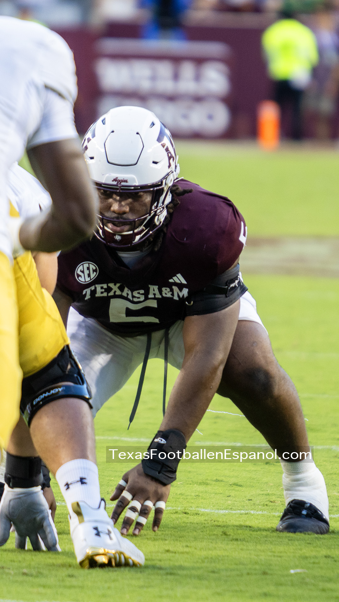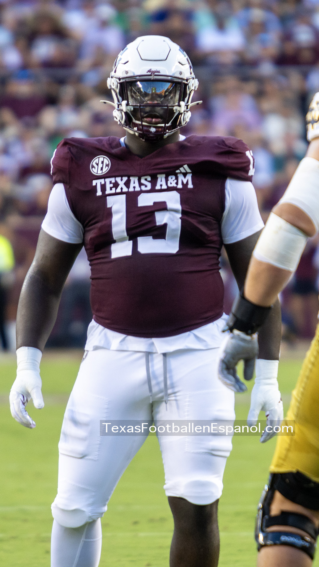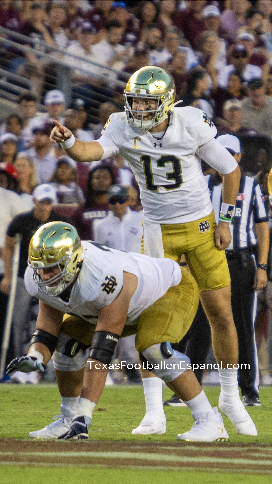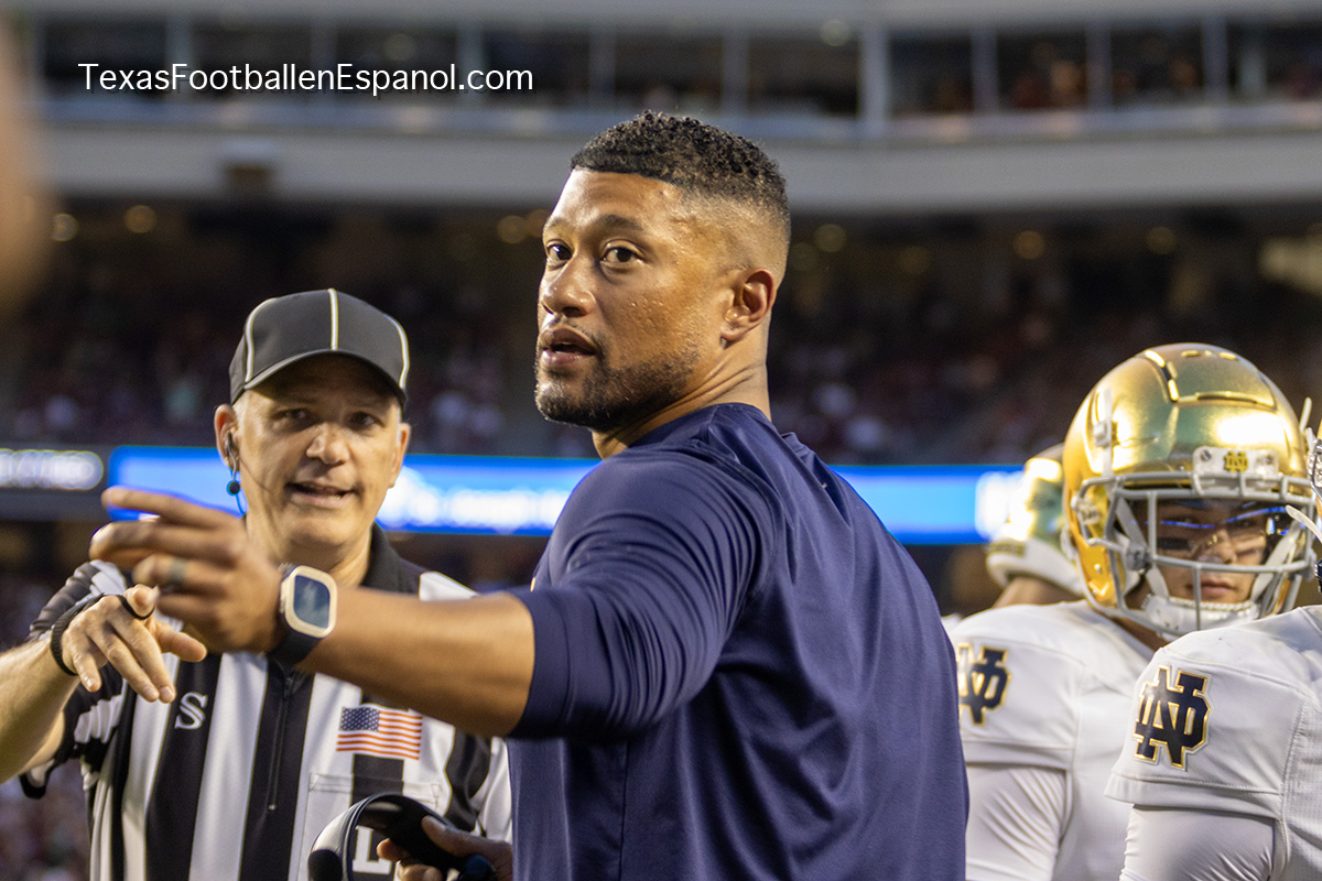 A group of thirsty horsemen arrived from South Bend to represent a battle between two top 25 teams. #7 Notre Dame faces #20 Texas A & M. Tonight 8.2 million people are watching the kickoff. The excitement is gigantic before the duel of two hungry teams. In Texas everything is bigger, even the noise. White pom poms everywhere in an electrifying atmosphere. Both defenses establish their rules immediately, the Irish defense is on a mission. We miss our friend Gabriel Rubio (97), but here are the two relentless steeds that have stood firm, neighing with courage. Rylie Mills (99) and Howard Cross III (56).