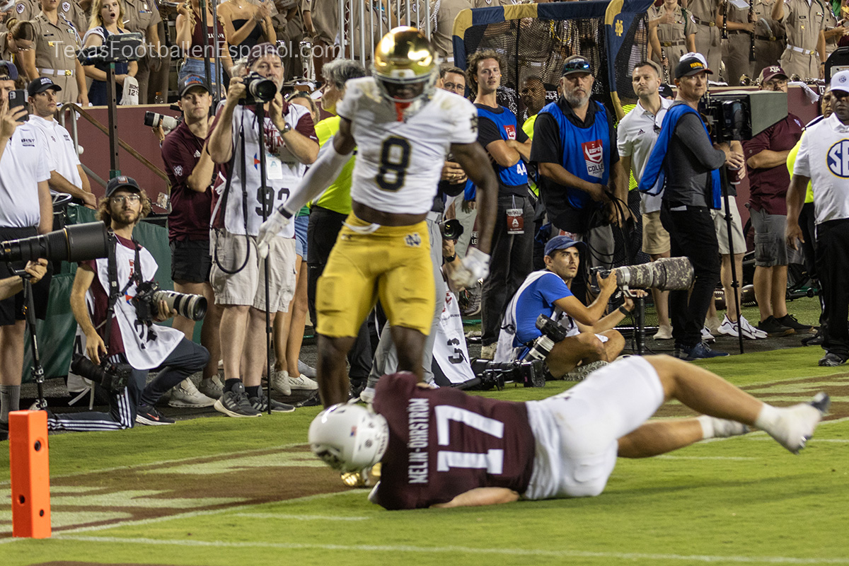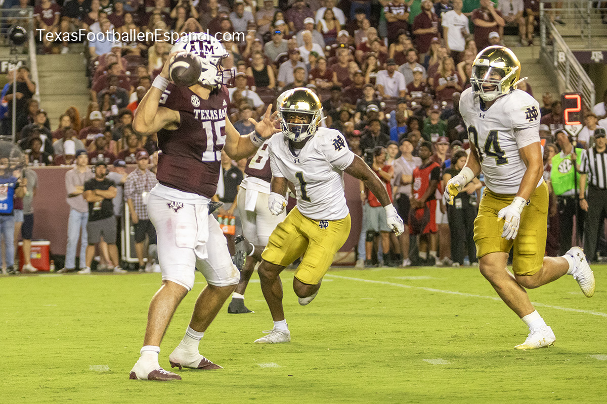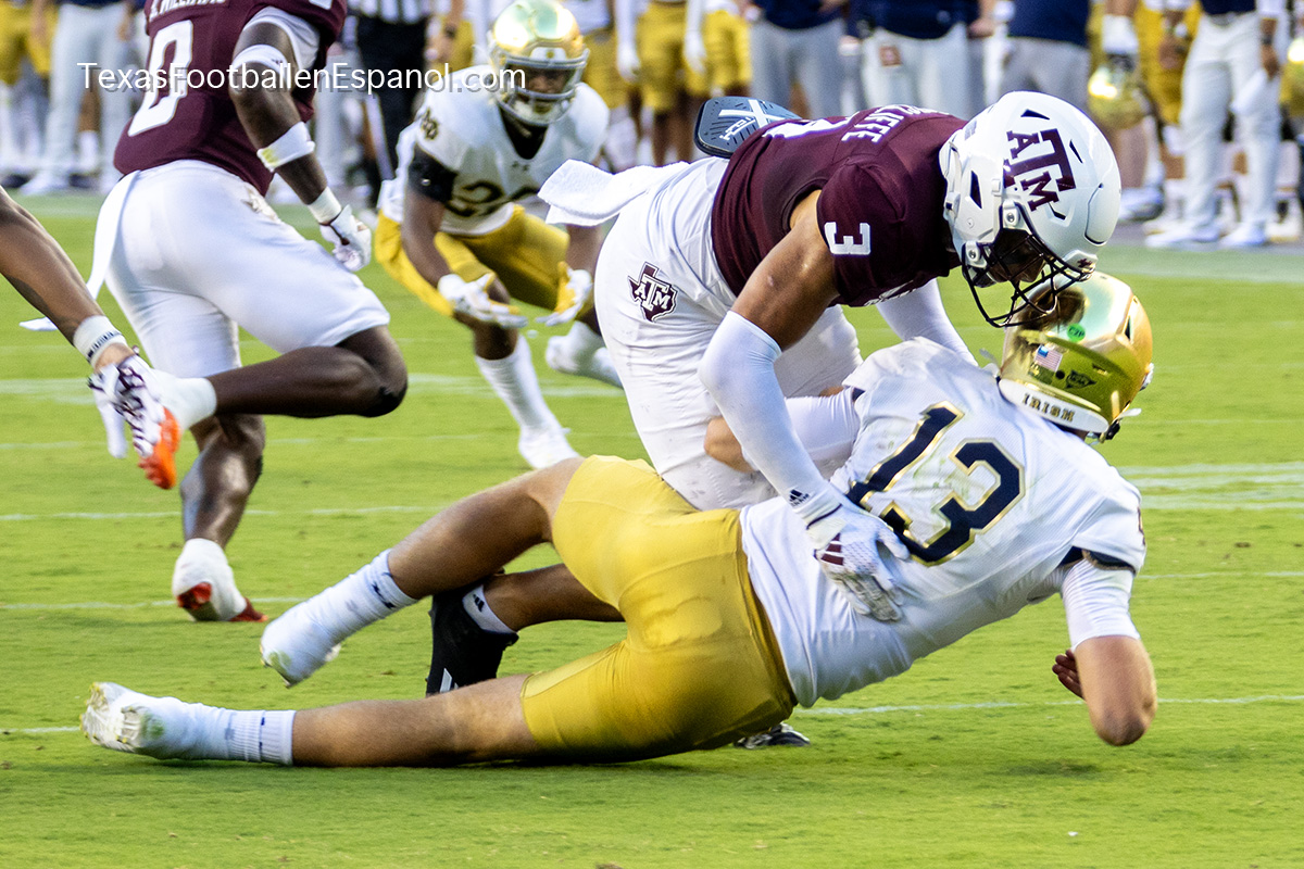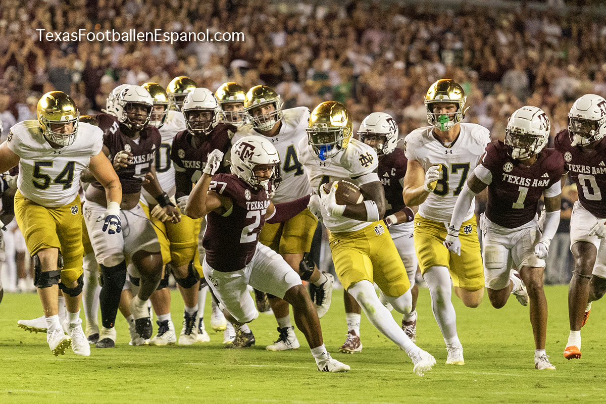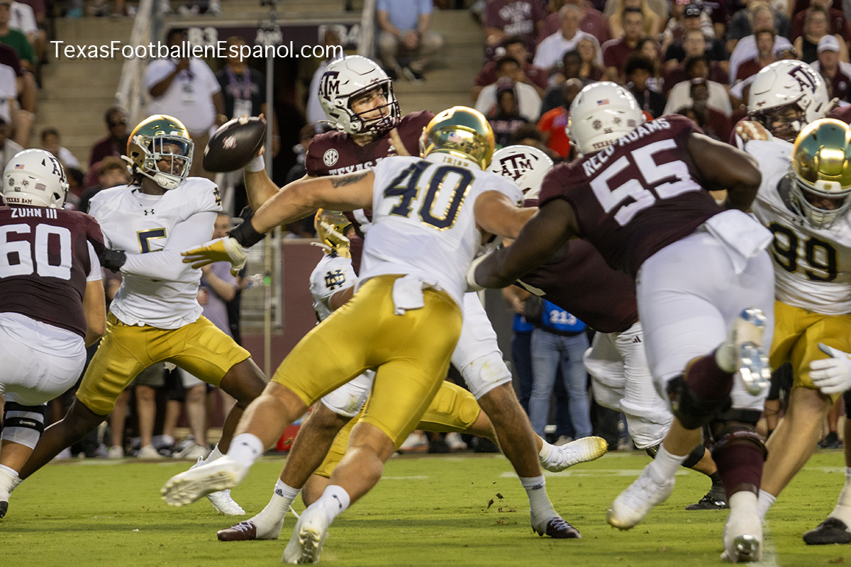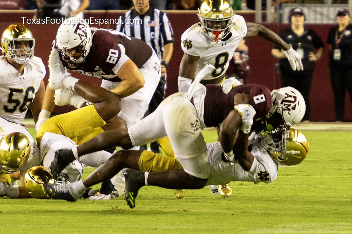 The Aggies show power by executing a pair of plays with pieces that evolve into a strategic duel. How and where are they going to direct the bullets? The QBs are throwing but no one can find the end zone. The Aggies kicked a 49-yard field goal, taking a 6-3 lead. Notre Dame running backs are breathing hard trying to find non-existent gaps. The lanes are closed and the ball carriers are trying to flee a stampede of maroon jerseys attacking in all directions. There is no place to run and no place to hide. There is DT Shemar Turner and LB Taurean York closing in and breathing down the neck of QB Leonard Riley. The 12th man calls for Irish blood in Texas.