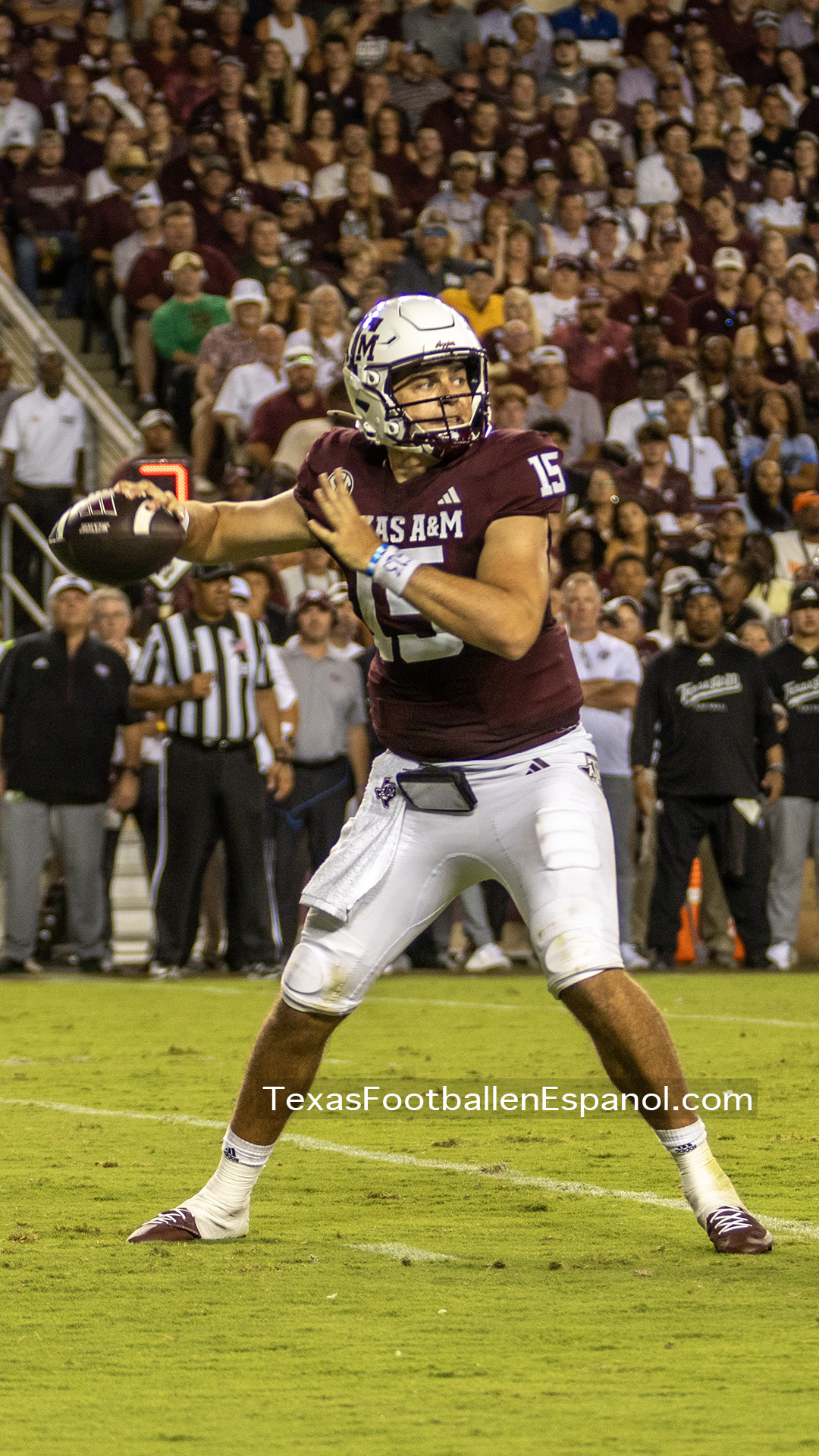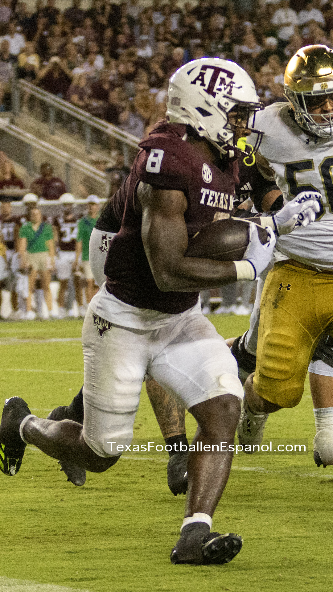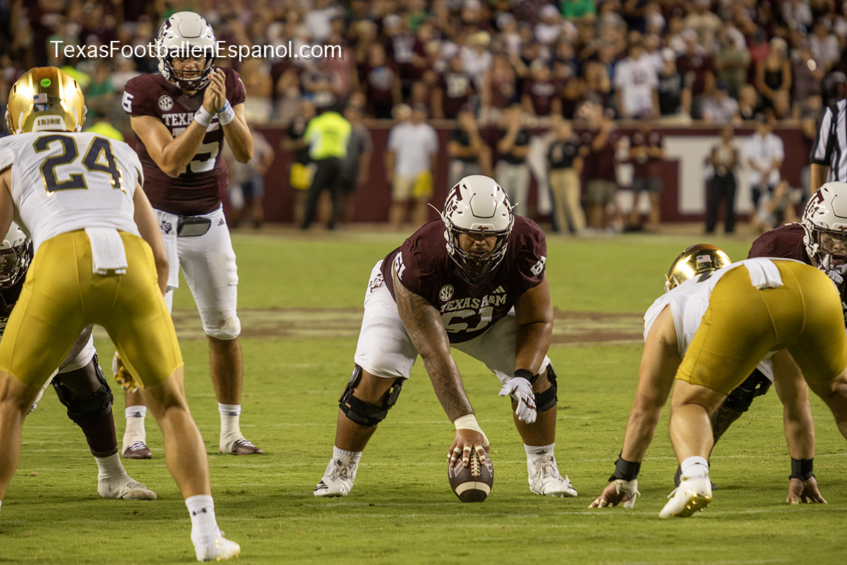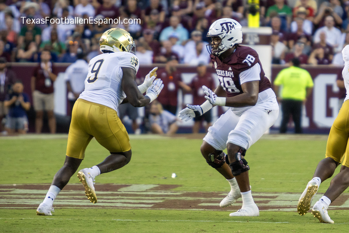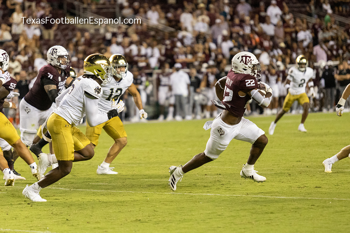 The Aggies show power by executing a pair of plays with pieces that evolve into a strategic duel. How and where are they going to direct the bullets? The QBs are throwing but no one can find the end zone. The Aggies kicked a 49-yard field goal, taking a 6-3 lead. Notre Dame running backs are breathing hard trying to find non-existent gaps. The lanes are closed and the ball carriers are trying to flee a stampede of maroon jerseys attacking in all directions. There is no place to run and no place to hide. There is DT Shemar Turner and LB Taurean York closing in and breathing down the neck of QB Leonard Riley. The 12th man calls for Irish blood in Texas.