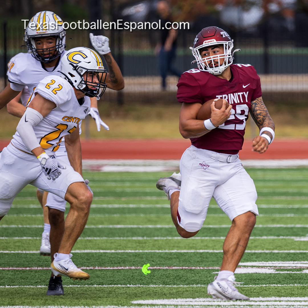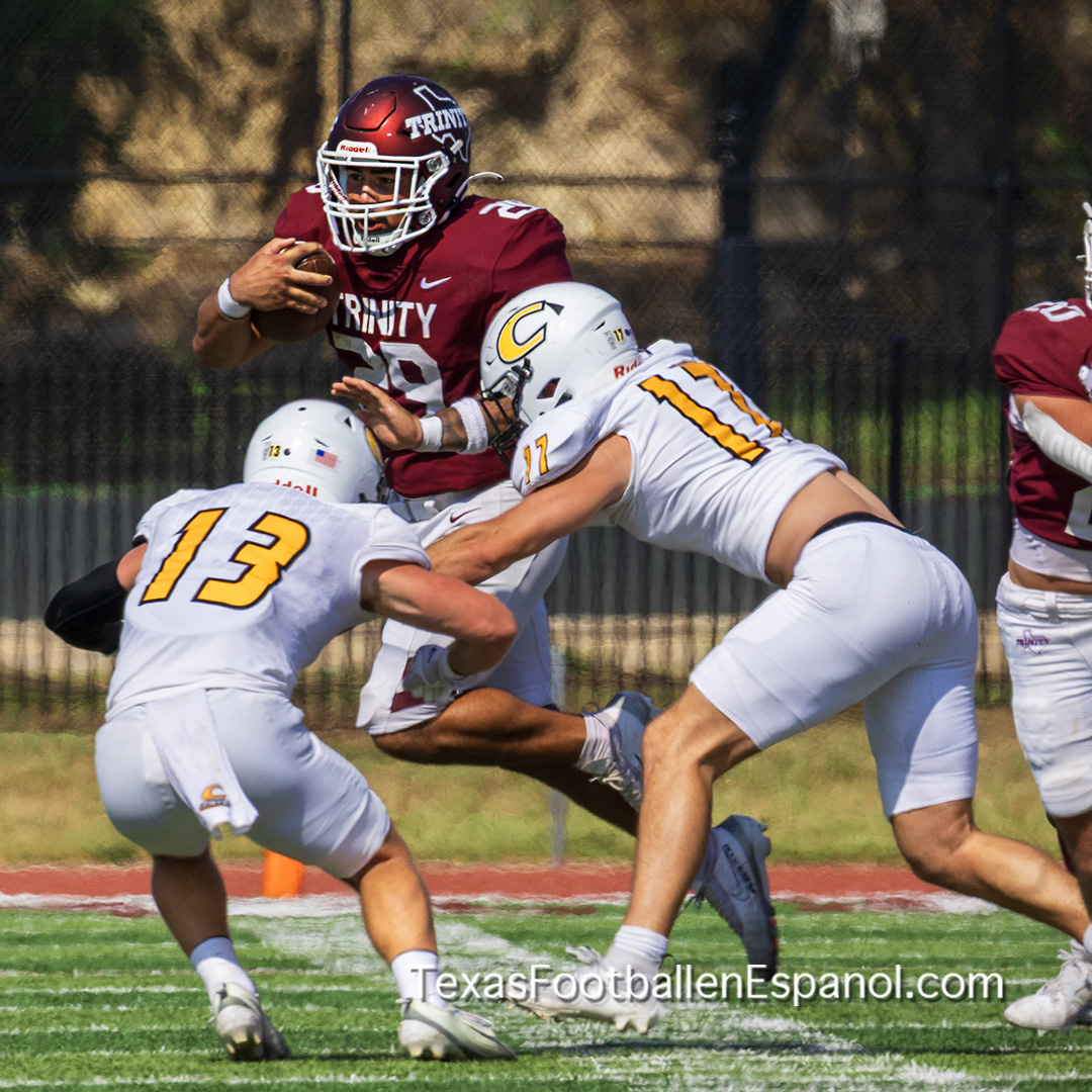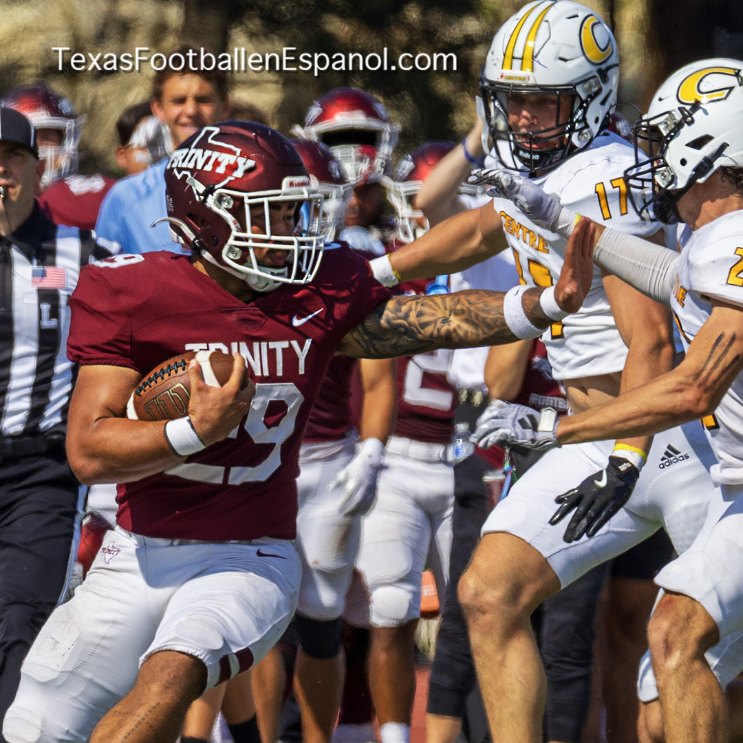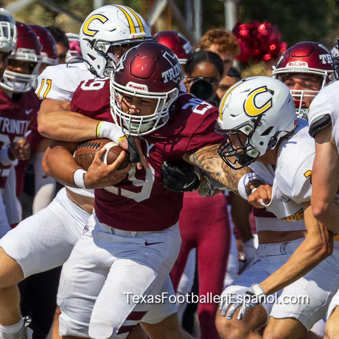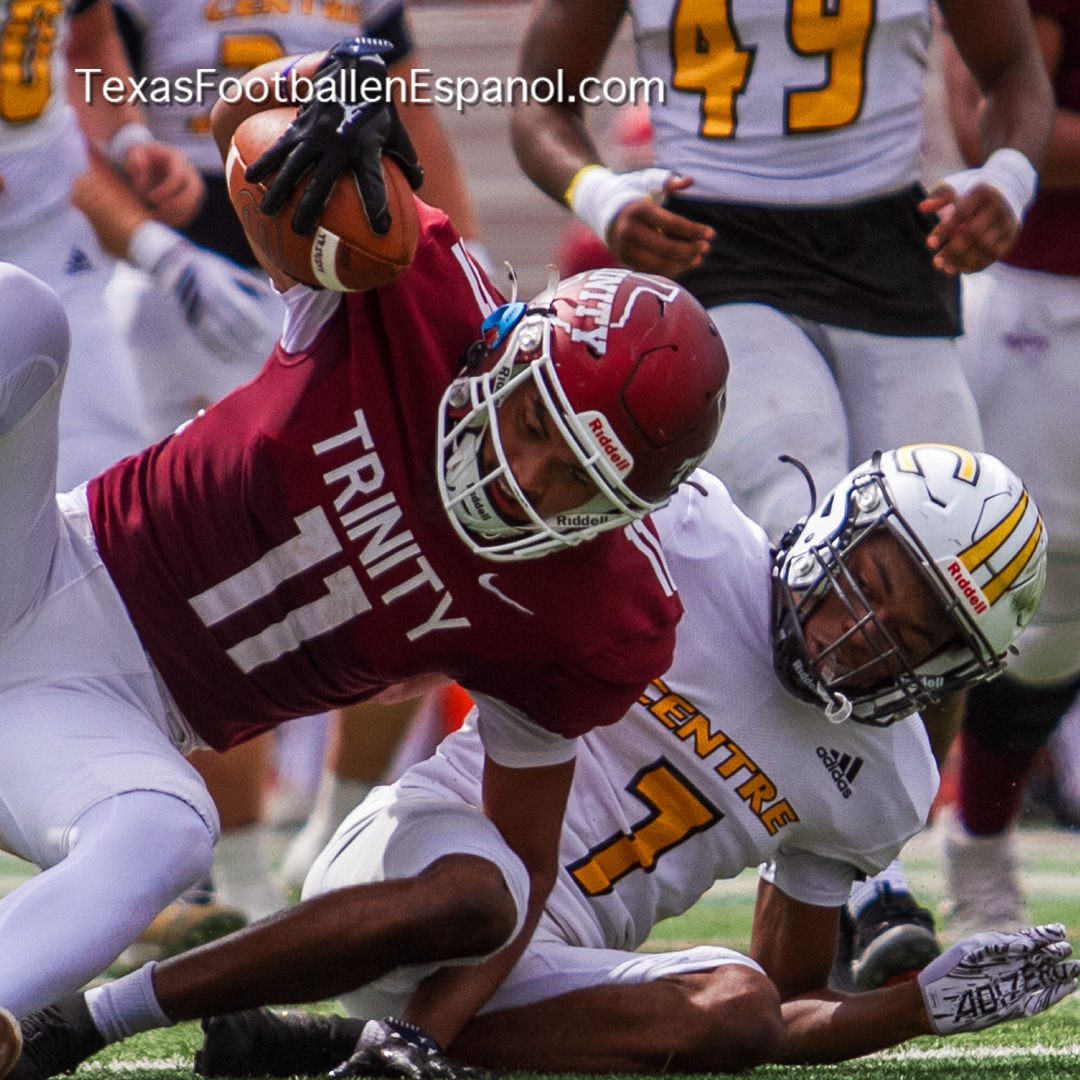 Trinity put up 389 total yards. This included a bruising 224 on the ground. They held Centre to just 210 total yards — and only 27 rushing.