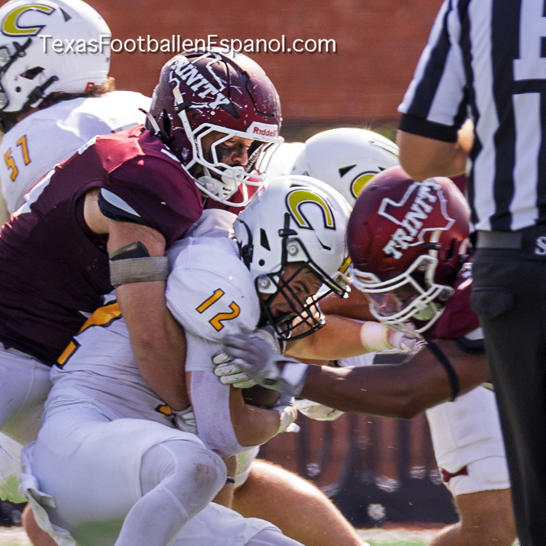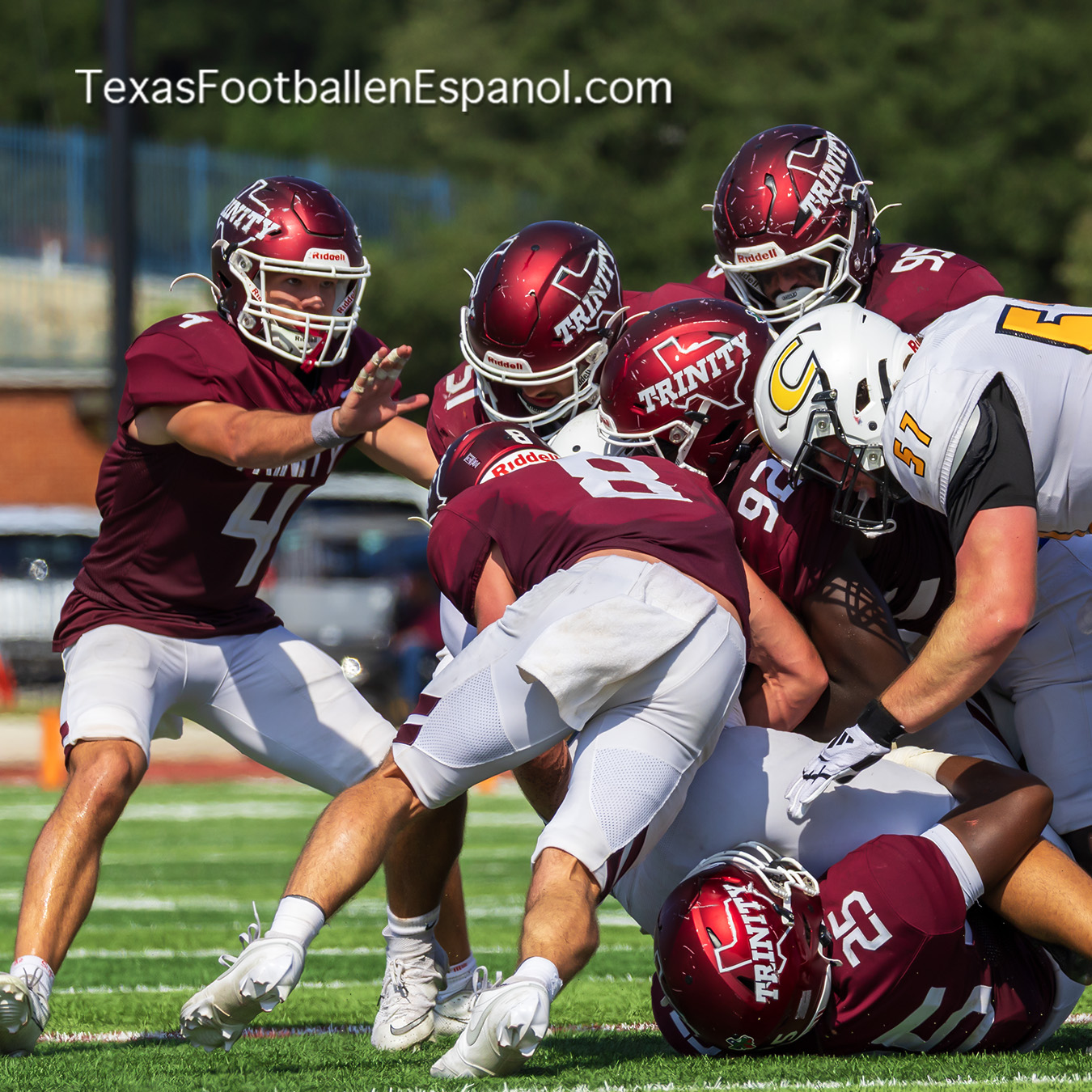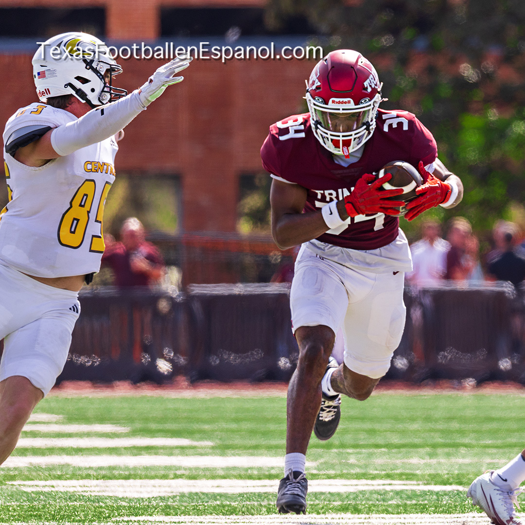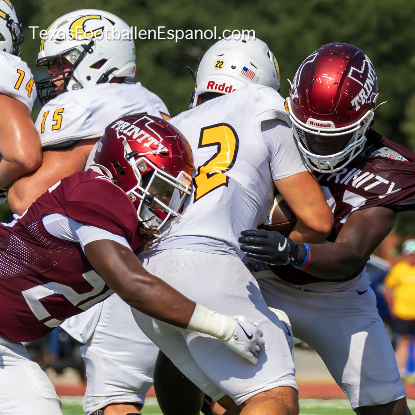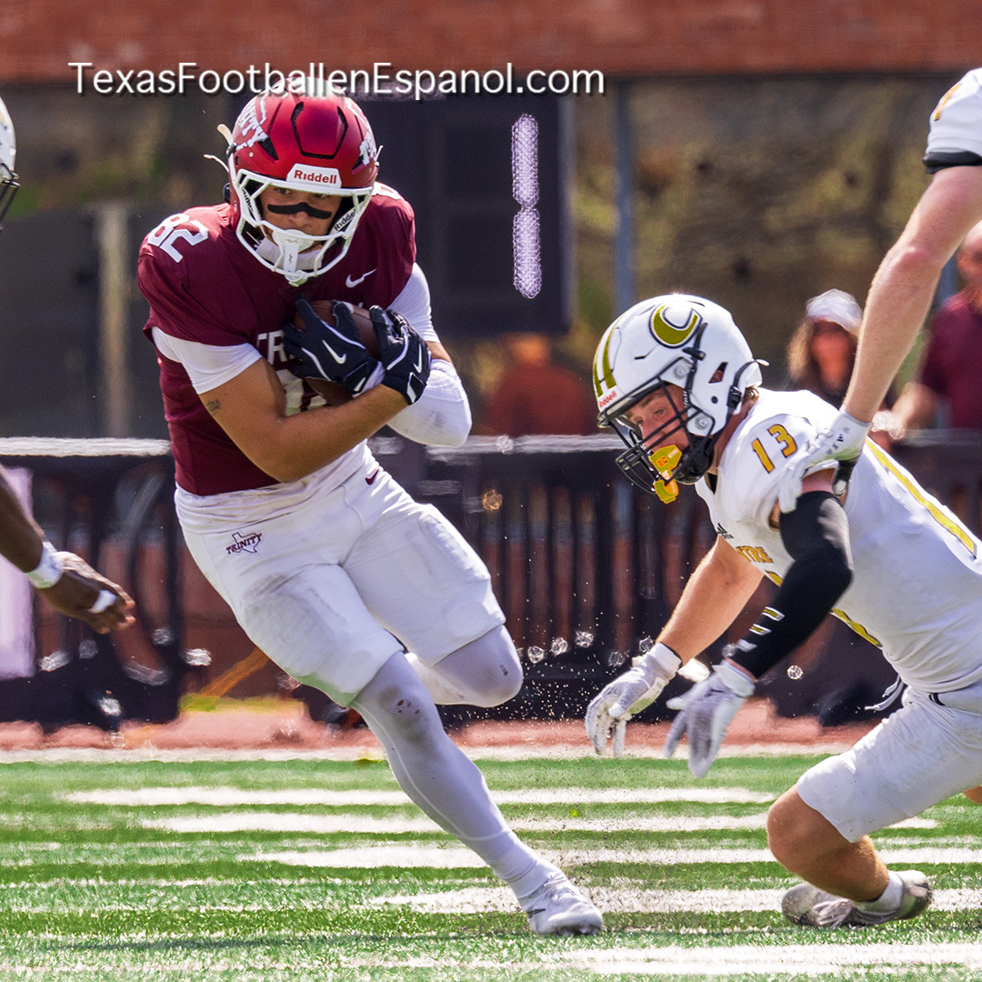 Trinity put up 389 total yards. This included a bruising 224 on the ground. They held Centre to just 210 total yards — and only 27 rushing.
